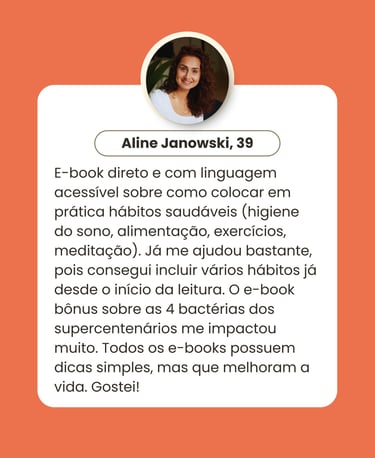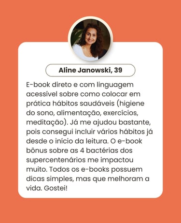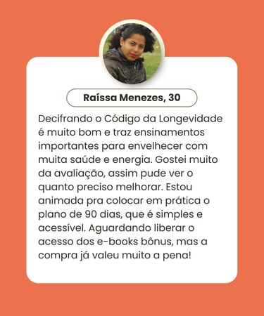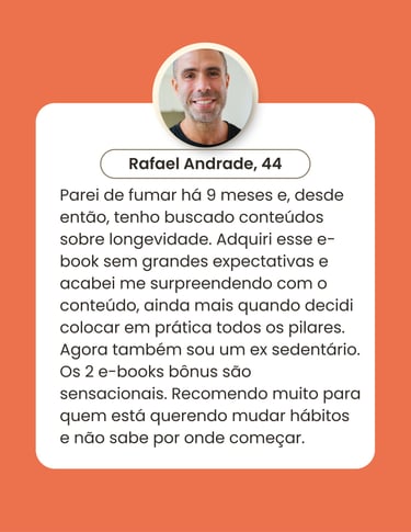 Apresento a você o método comprovado do meu e-book “Decifrando o Código da Longevidade”, que revela, com base em evidências científicas, como os 4 pilares da Longevidade podem ser aplicados de forma funcional ao seu dia a dia, com ferramentas práticas e personalizáveis. Aqui, você vai descobrir o passo a passo claro para tomar o controle, investir no seu maior ativo (sua saúde) e começar HOJE mesmo a fazer pequenos ajustes na sua rotina, sem abrir mão do prazer de viver.